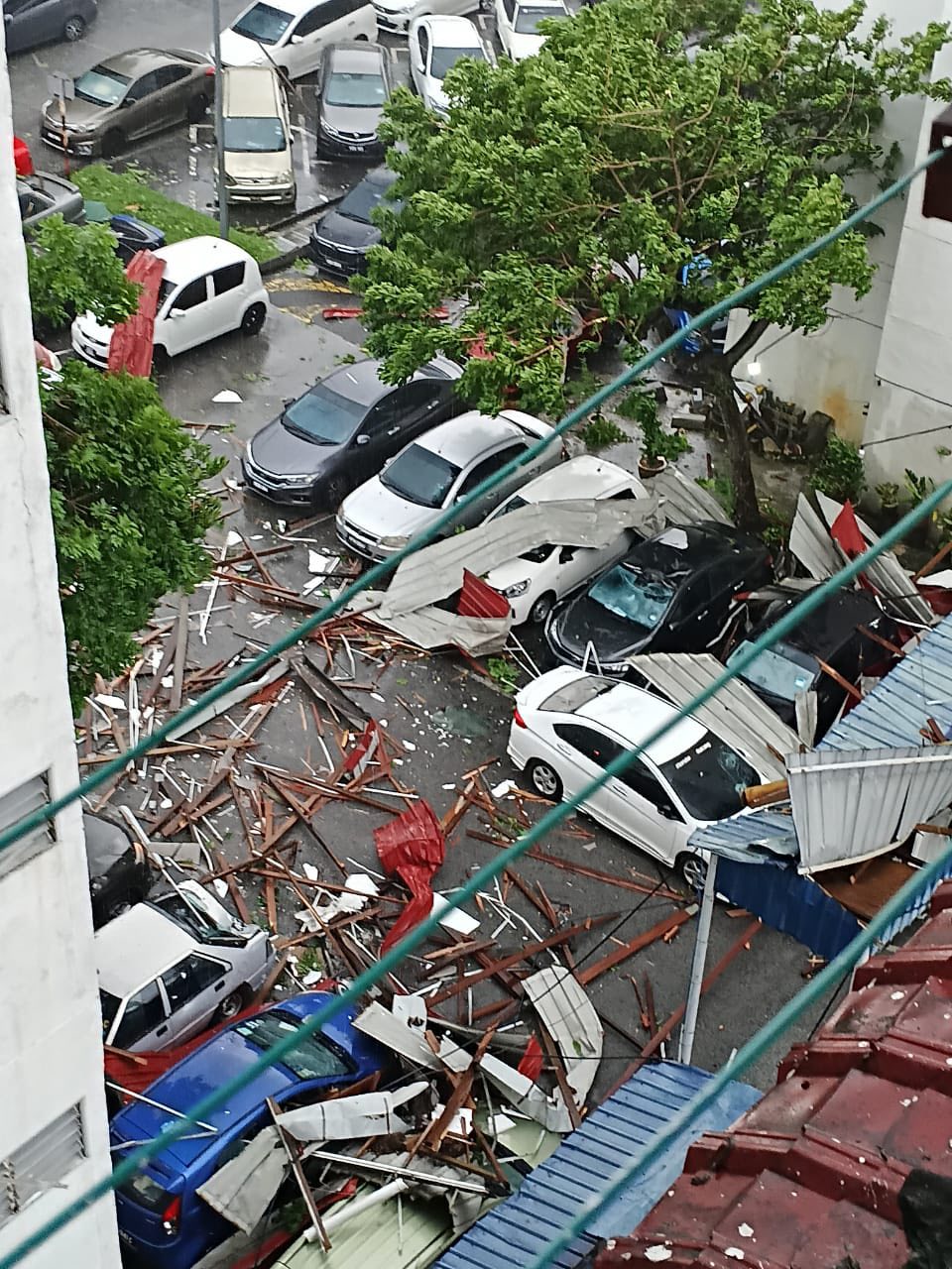 班底谷的斯里千百家E座和F座组屋屋顶被强风吹掀,屋瓦、木条、锌板等也坠落击中泊在底层的轿车。