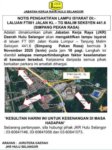 乌鲁雪兰莪县工程局于周一(3日)上午10时,重启位于联邦公路FT001吉隆坡-丹绒马林441.6,也即是叻思路口的红绿灯。