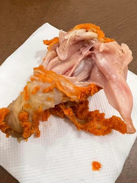 据网友帖文的照片显示,该炸鸡腿肉内部呈腥红色,且部分肉仍与骨头紧黏着,表示该肉尚未煮熟。