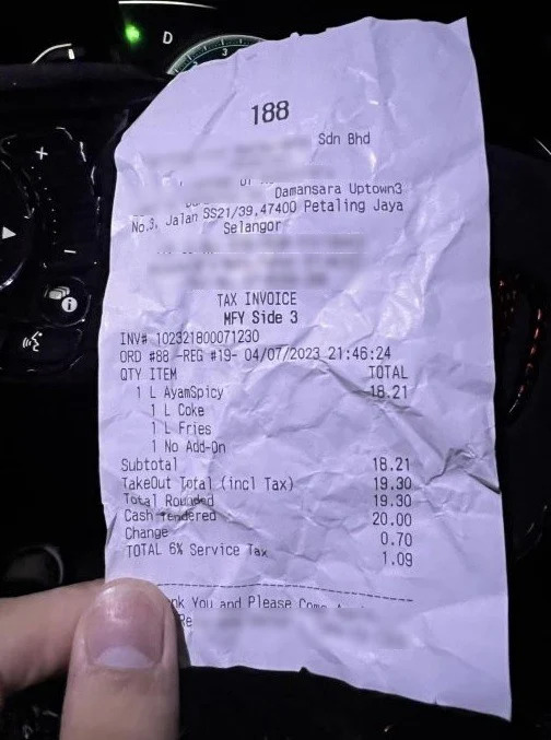 同时,该名网友在帖文中上传收据,收据显示涉事的快餐店则位于白沙罗上城。